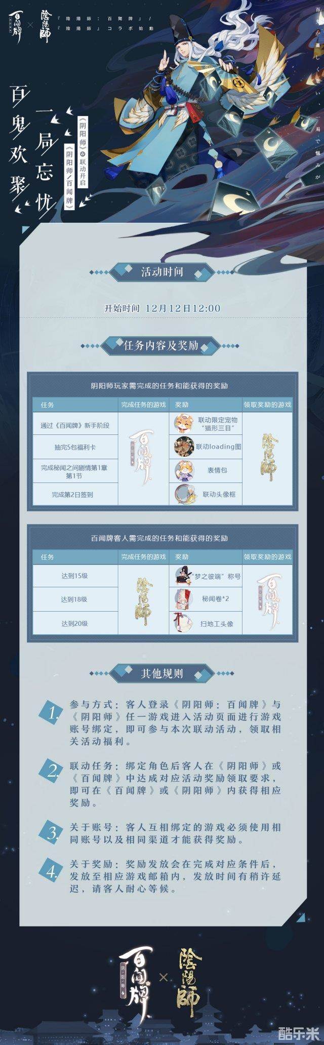 直播的压轴大戏,三方游戏策划们向大家介绍了本次联动活动。此次联动福利将于12月12日《阴阳师:百闻牌》全平台上线当天12点正式开启,为三家游戏粉丝带去不容错过的惊喜。只要在《阴阳师:百闻牌》中完成新手阶段,抽完5包福利卡等内容,即可进入《阴阳师》领取联动限定宠物“猫形三目”、联动loading图等奖励;而在《阴阳师》中达成一定等级,分别可从《阴阳师:百闻牌》内领取“梦之彼端”称号、秘闻卷x2、扫地工头像。
