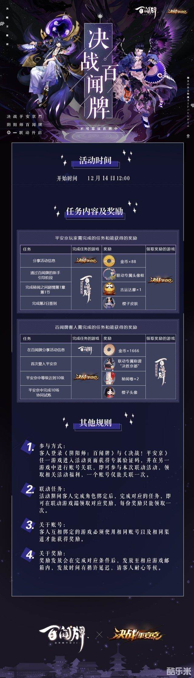 另一方面,《决战!平安京》与《阴阳师:百闻牌》的玩家。则可通过分享活动信息 ,分别获取金币x88,与金币x1666。只要通过《阴阳师:百闻牌》的新手引导阶段,完成秘闻之间的剧情第1章第1节等,就能进入《决战!平安京》得到移动专属头像框、吉运达摩等福利;或是在《决战!平安京》内登录,达成一定等级与协同试炼,便能得到《阴阳师:百闻牌》中的联动专属称谓“决胜京都”、秘闻卷x2与樱子头像。