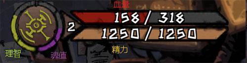 理智值:魂值左边的绿条(初始为绿色,过低会变为红色)是理智值。这是本游戏中非常重要的一个属性,吃血药会扣除理智值。理智值分为四个阶段,具体见下图。过低的理智值会获得debuff,并且视野受限。高理智时装备掉率也会提高。