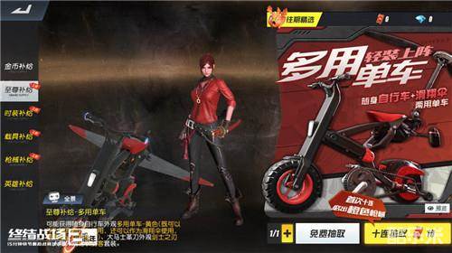 在抽取多用单车时,玩家除了有机会获得更多变色款单车外,还有机会收获大马士革刀外观“剑客之刃”和人物外观“红衣剑客”套装。而当抽取至尊补给达到一定次数时,也可能直接兑换以上多用单车、剑客外观以及其他游戏道具。