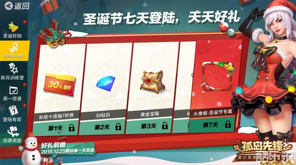 圣诞活动期间还将推出特别签到奖励,12月23日起解锁第一天奖励,登陆就得补给折扣券、钻石、黄金宝箱以圣诞节专属头像框!