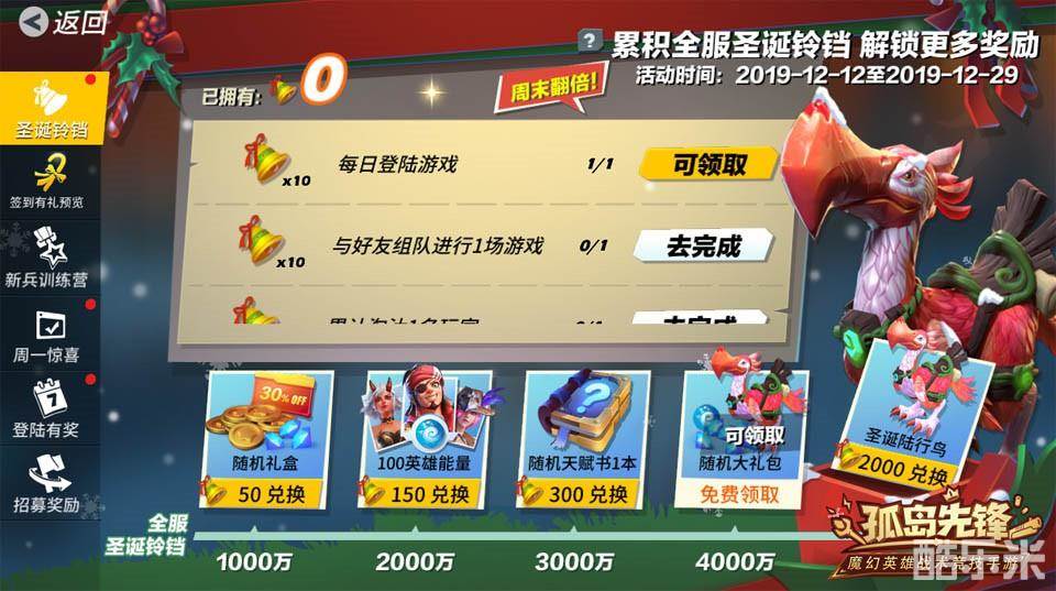 为预祝圣诞节的到来,《孤岛先锋》首个全服热力活动开启,12月12日更新后至12月29日,玩家完成指定任务后可以领取铃铛。当全服玩家领取铃铛总数达到一定数量时,系统将解锁各种惊喜礼包。