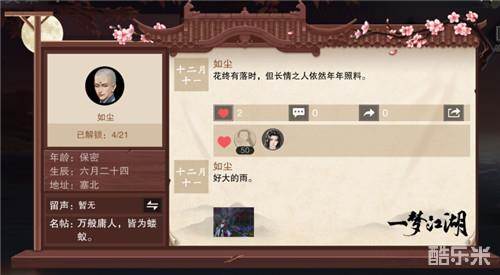 江湖少侠的冲浪生活怎么少得了“朋友圈”?灵犀系统上线后,四位NPC也对玩家开放了自己的江湖客栈,分享生活点滴与感受,玩家也能在客栈里与他们互动。细细品来,甜蜜小心思都藏在TA的三言两语中。