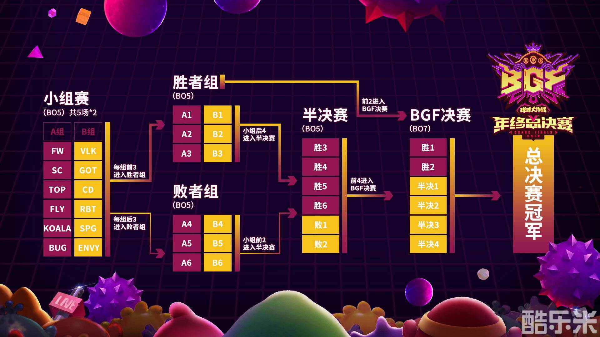 12支参赛战队共分为A、B两组进行角逐,进行两轮组内BO5,经过激烈厮杀,继续进入胜者组BO5、败者组BO5赛轮,在两天紧锣密鼓的战事后,最终确定BGF决赛阵容。