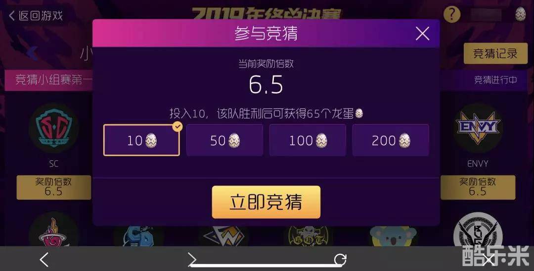 2、选择支持的战队进行“投入竞猜”(每场比赛投入不得超过200个龙蛋),1月12日比赛结束后,即可在“竞猜记录”中查看结果!