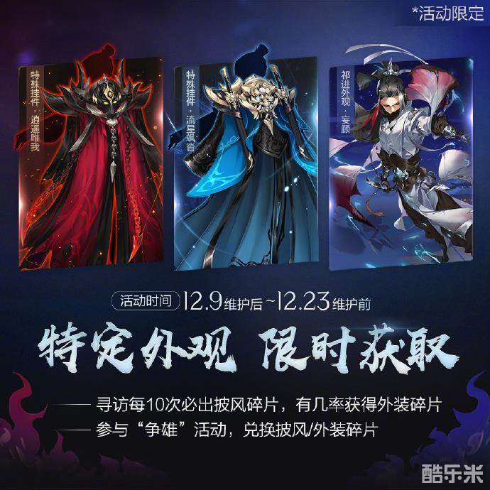 少侠除了参与【大师赛助力活动】之外,通过【寻访】玩法亦可获得活动特定披风碎片【逍遥唯我碎片】【流星飒沓碎片】、祁进特定外装【妄顾】碎片,集齐一定数量外装碎片后,即可合成永久外观!