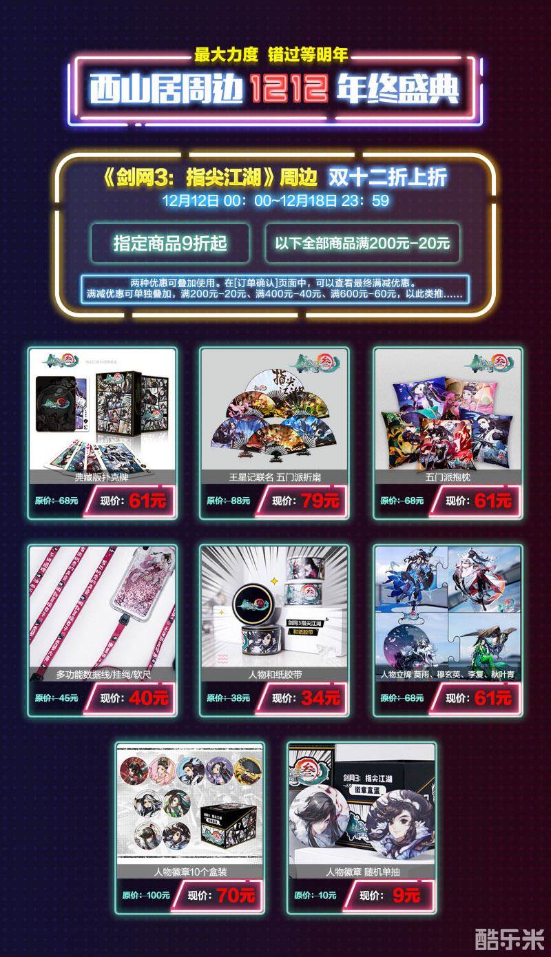 今日起至12月18日 23:59期间,西山居周边商城《剑网3:指尖江湖》商品9折起售,每满200元即减20元(400-40、600-60以此类推)!优惠折扣和满减优惠均可叠加使用,全年最低价就在这一刻!