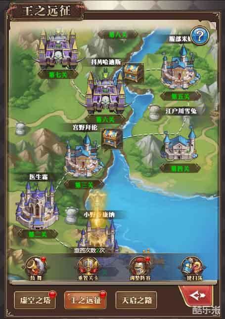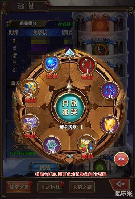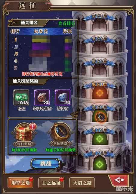 远征战斗与常规战斗不同,远征战斗结算后,帝王当前血量会保持到下一关。如果帝王血量为0时,下一关则无法再上场战斗,直到重置。玩家只有顺利通过前一关方可点击下一关。我们每天有一次机会免费重置关卡,VIP5及以上玩家可通过消耗钻石获取额外的一次重置机会。玩家在通关以后即可获得抽奖机会,获得不同帝王碎片和战灵材料,从而提升帝王的战力。玩家每次可以免费抽取两种材料,亦可通过消耗钻石获取所有的奖品。 除了王之远征以外,虚空塔亦是游戏中提升等级的重要途径。通关虚空塔可以获得海量的角色经验,帮助玩家快速提升等级。