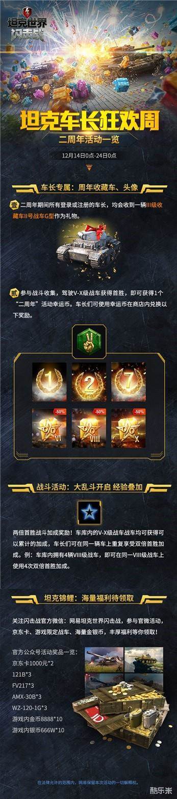《坦克世界闪击战》还将在此次周年庆中选出坦克锦鲤,京东卡、游戏限定战车、海量金银币等丰厚奖励!车长们只需关注游戏官方微信公众号:坦克世界闪击战,并积极参与官微活动,就有机会成为年度锦鲤,囊获千万福利!