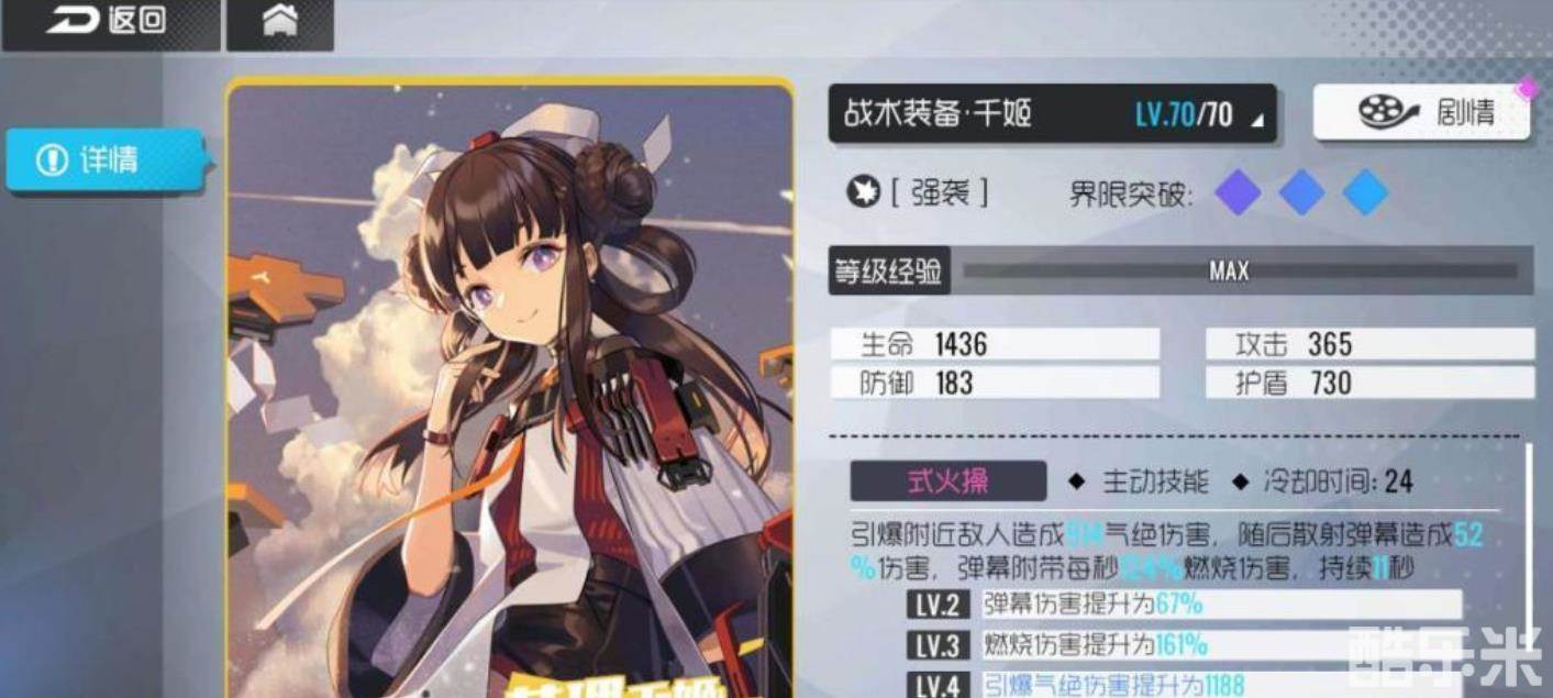 千姬一般的形象是巫女,非常温柔,但女仆装的千姬则别有一番可爱的风味,比较娇羞,而千姬在游戏中的定位是守护和辅助,主动技能清小兵非常好用,武器是霰弹枪,近程能打出高伤害,在三人阵容中可以作为辅助定位,配合上步枪和狙击枪等角色比较好,虽说是辅助,但也是紫色稀有度的角色,还是值得培养的,关键是非常可爱哦!