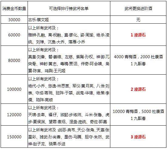 1、活动期间,累计消费金币数量达到对应金额,可以联系在线客服申请1个排行榜武将奖励,或对应金额的进阶酒或橙源石奖励;