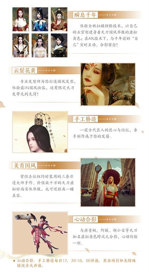 少侠们将可以体验扫描捏脸+AR拍照技术,和天刀江湖中身着华服的自己交互合影,一秒穿越大宋。还有天刀NPC合影、国风妆造等!