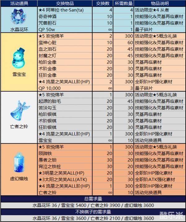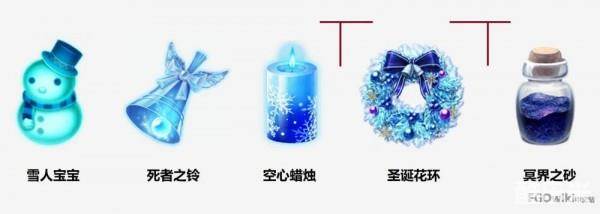 本次活动兑换道具为4种,分别是蜡烛、铃铛、雪人和冥界之砂。其中冥界之砂为无限池兑换材料,具体兑换项目将在第三部分呈现。