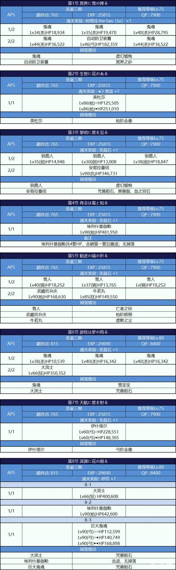 主线本由8节剧情构成,在维护结束活动开始后可攻略第一节剧情,之后每天0点整开放下一节,直到第六天开放7&8节剧情关卡。开放剧情关卡的同时,会开放相应的周回本,苹果不多或者不是圣僧的御主,可以选择全部周回本开放之后的第六天开始,选择掉落较高的本进行相应地刷取,掉落的原则还是越后面的周回本对应的掉落材料数越高。详情可参考自由本配置&掉落说明。