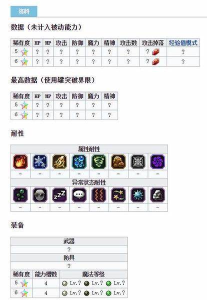 | 5 | ? | - | 黑暗 | 对1名敌人发动暗属性魔法 (1.2x) | 1 | 3 |