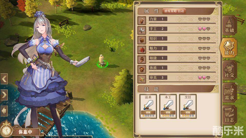角色能力菜单,能看到属性和技能。进行修炼可以提升属性,红心代表天赋能更快速的提升属性。属性达到要求可升级技能,技能其实就是某个职业的熟练度,技能越高即越强大,比如烹饪效果提高,物理攻击提高。
