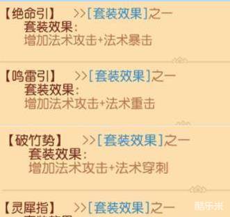 相对应的法术输出套装同样有分为暴击、重击、穿刺和特效命中四种,适用职业为龙宫,方寸;