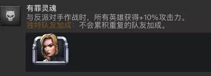 这个组队算得上寡姐用处最大的,和局长的组队一样,算得上挂件,与反派对手作战加10%攻击,寡姐自身也可以享受这个组队加成,还算不错。