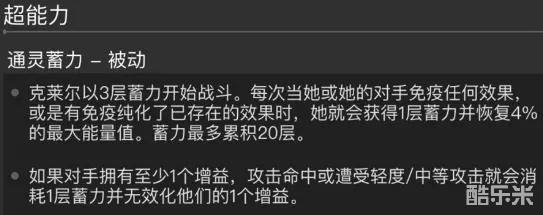 在封对手增益期间,对手出的每一个增益都会转为寡姐的1个通灵蓄力数和4%能量。