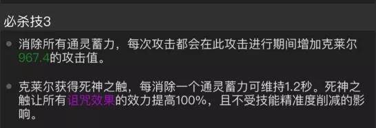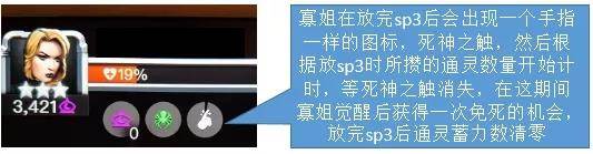我觉得这个觉醒是有点鸡肋。首先是要放完sp3后才能触发死亡免疫,而且死亡免疫时有时间限制,在血条下面会多一个手指一样的黑色圈圈计时,时间到了就无法再免死,而且跟免死计时跟通灵蓄力挂钩,1个蓄力维持1.2秒,最大20个就是24秒,时间可以说非常长,但是实战能用到的机会真是少之又少。