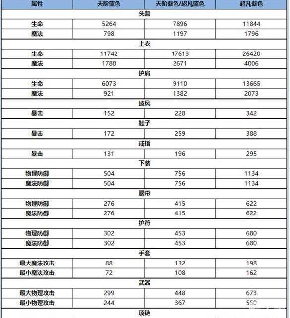 从表格里可以看出来,天阶紫色和超凡蓝色基础属性是一样的,同理,超凡紫色基础属性和神阶蓝色是一样的。
