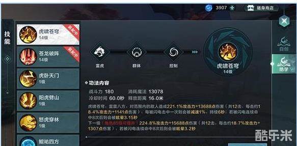 【虎啸苍穹】是一个集群体输出与控制一体的绝学,技能对范围区域内造成12次闪电攻击,每次闪电附带减速效果,闪电多次命中敌人则能造成晕眩效果。