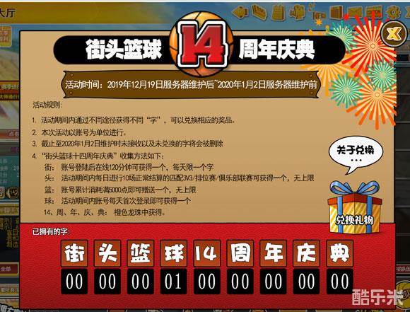 活动期间内通过不同途径获得不同“字”,可以兑换相应的奖品,本次活动以账号为单位进行。“街头篮球十四周年庆典”收集方法如下: