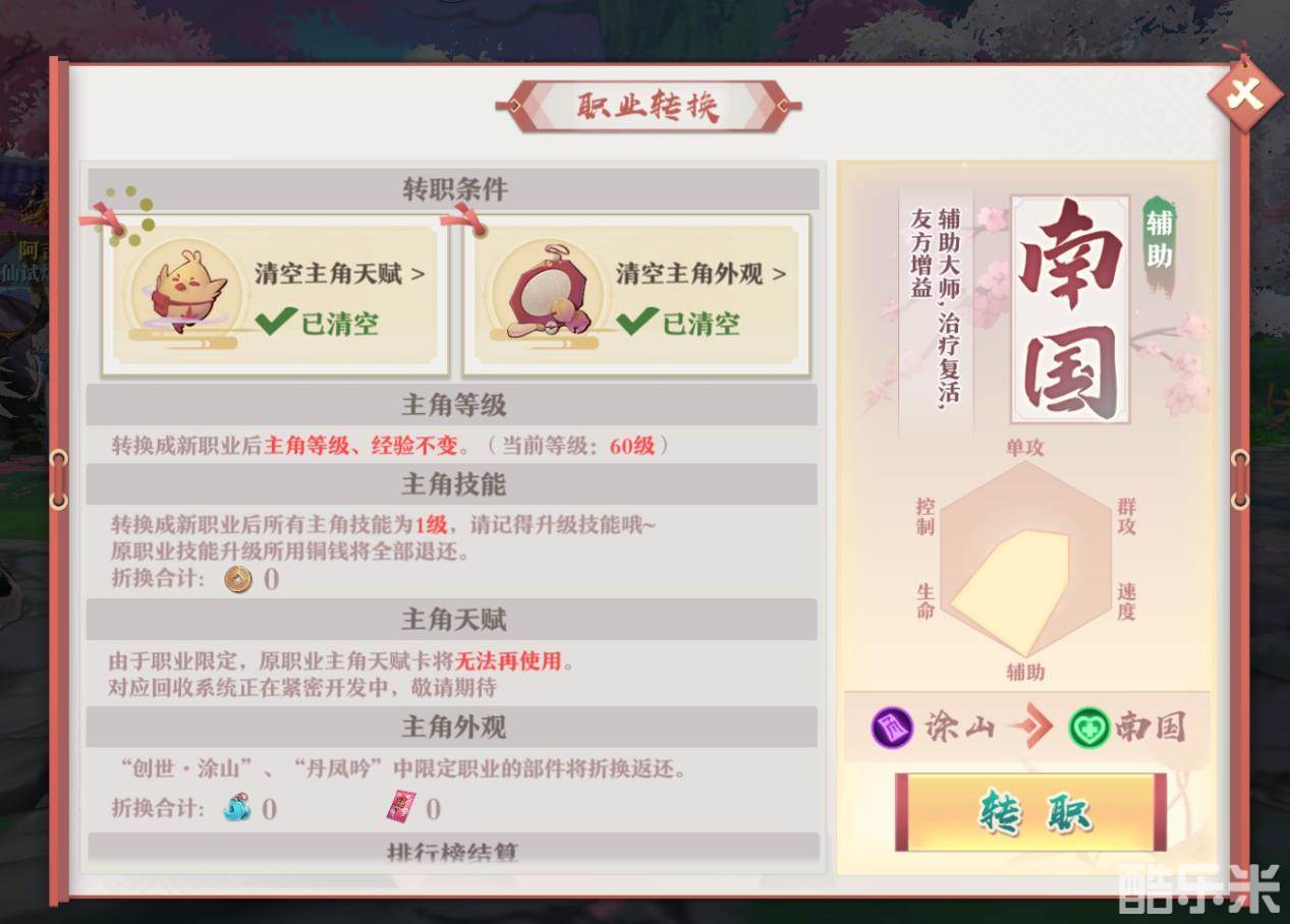 转之前,需要红线仙卸下本职业专属的天赋卡和外观。同时,当你转职后,原职业的部分功能将被重置并给予补偿。如角色技能、限职业外观等,重置后游戏会退回等价铜钱、霓裳券或绑玉。当然,转职后大部分限时活动排行榜将被清空,各位红线仙一定要合理安排转职时间哦。