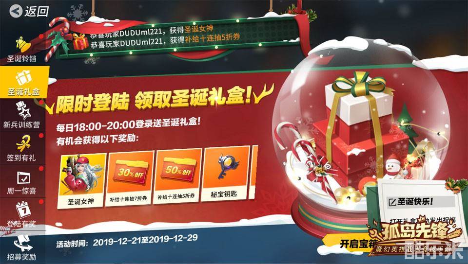 在12月21日至12月29日期间,玩家每天在18:00—20:00时段登录《孤岛先锋》还可以领取特别订制的“圣诞礼盒”,里面装满了各种各样的惊喜福利,为玩家送上温馨的圣诞祝福。