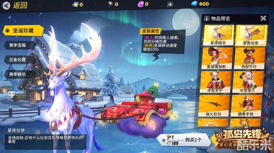圣诞主题系列还包括变身宠物传奇皮肤“驯鹿小子”,坐骑传奇皮肤“星夜精灵”和双人坐骑终极皮肤“星夜信使”,陪你一起度过欢乐圣诞节。