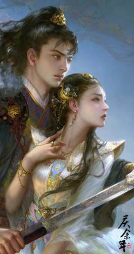 这幅画整个意境还是想比较深沉唯美的,既要体现权谋剧的氛围,同时又要表现两人之间的恋人关系。所以选择了阴云密布的夜晚,地点是皇宫大内,象征男女主人公身处阴谋疑云中的处境。动态设计是比较有难度的方面,特别是在爱意缠绵与凌冽肃杀之间的平衡,因为一开始得到的需求是要两个人抱在一起共抗外敌~~觉得这个情境好难实现。之前还试过搂腰、搭肩、摸脸之类的姿态,后来也都被自己否定掉了,也有朋友给了我很多不错的建议,比如舞剑改为拔剑,有锋芒而不过于外露;比如搂抱改为环绕,有呵护而不至于露骨;比如摸脸改为摸胸,呃~是摸自己的(汗~越描越黑),表现女主一种防御危险的心态,当然还得表现得唯美自然。其实人的一个微小姿态的变化其暗示的含义都存在很大区别的,需要细细斟酌权衡。