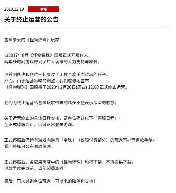 自2017年8月《怪物弹珠》国服正式开服以来,两年多时间游戏得到了广大玩家的大力支持与厚爱。运营团队也和各位一起度过了无数个欢乐而难忘的日子。然而,由于运营策略的调整,我们遗憾地宣布:《怪物弹珠》国服将于2020年2月20日(周四) 12:00 正式终止运营。我们为终止运营给各位玩家带来的诸多不便表示深深的歉意。