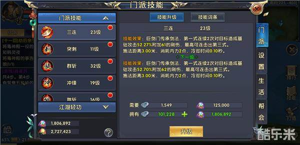 在技能专属经验不足的情况下,建议先对以下技能进行加点。首先是普攻技能三连,必须加满。它的第一式连续两次对目标造成伤害并附加刚伤,最高可连击出第三式。优点是因为三连是AOE技能,而且冷却时间是所有技能中最短的,能瞬间打出高额伤害。