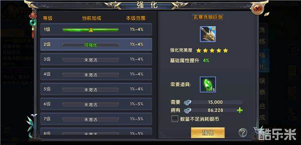游戏中设置的强化等级一共有15级,而每一级又有强化加成度。每成功强化一级会随机提升该等级的强化加成,最低1%最高5%,玩家可以对已激活的强化等级进行重铸达到最高加成效果。虽然巨剑是一个肉,但攻击不能落后。这里建议玩家先强化武器,毕竟武器是伤害的主要来源,接着是首饰,最后才是防具。