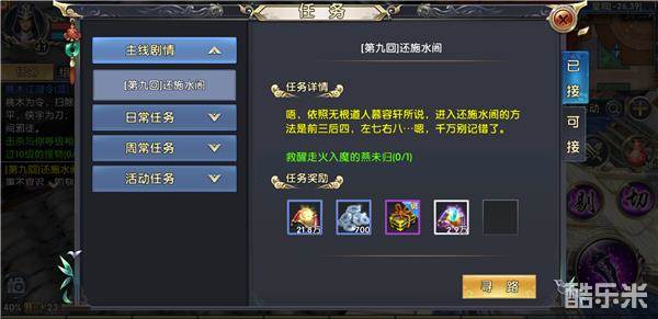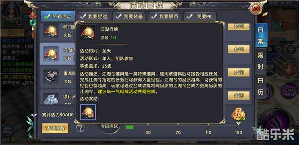 在达到25级后伴随开启的活动还有江湖行侠,想要参与此任务玩家需要消耗桃木令。使用该道具后可接受相应任务,完成指定的任务和可获得大量经验。桃木江湖令的品质越高获得的经验也就越高,玩家可通过合成功能将品质相同的桃木令合成为更高品质的桃木令。由于该任务主要就是杀怪,建议与上面所提的一气呵成活动共同完成。
