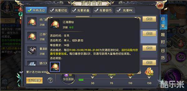 玩家在达到十四级后,会开启游戏中第一个可以获得大量经验的活动任务——江湖酒仙。此任务全天开放,可以单人或组队参加。要想参加饮酒就需要材料竹叶青,竹叶青一共分为五个品质,品质越高获得的经验也就越高。活动必须在京城的喝酒区域才可以使用酒,每天能够参加两次。值得一提的是在每天11:00-13:00,19:00-21:00这两个时间段饮酒能获得经验加成,玩家注意把握时间。