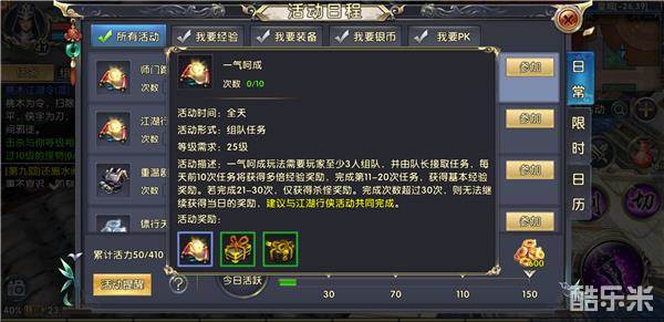 一气呵成和江湖行这两个任务是相辅相成、互相配合的,玩家在接取活动的时候切记要两个一起,能做到事半功倍。它们是大侠们提升等级最为有效的手段之一。配合以上三个活动任务,加上主线任务的经验,玩家想在极短时间内达到40级完全不是梦,后期的帮派活动以及游戏提供的离线经验,升级还是轻轻松松的。