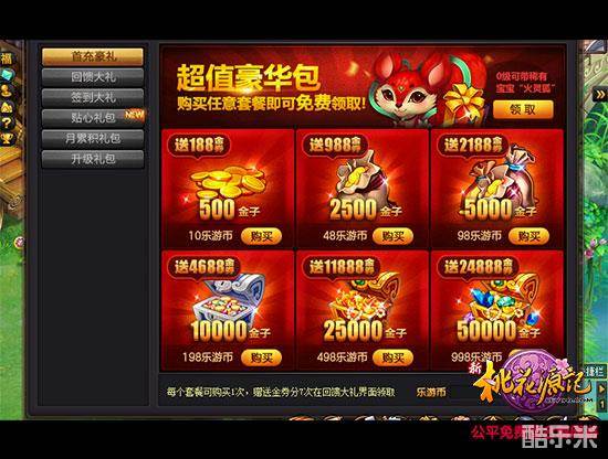 绝对超值的乐游币套餐,最多直接赠送24888金券,任意套餐再送价值12888金券的套餐赠送豪华包 (内含稀有召唤兽火灵狐与拉风蓝狼坐骑,更有500金券等丰厚奖励!)详情请登录《新桃花源记》内福利中心回馈大礼界面查看。