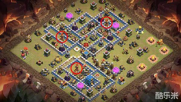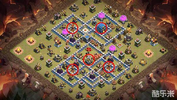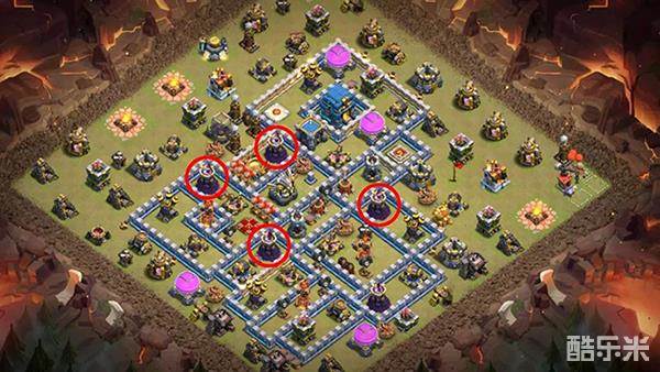 法师塔靠外组成防御链,让蝙蝠的威胁大大降低。大本营用多层城墙包围起来,可以有效分流对方部队,也能起到很好的防御作用。