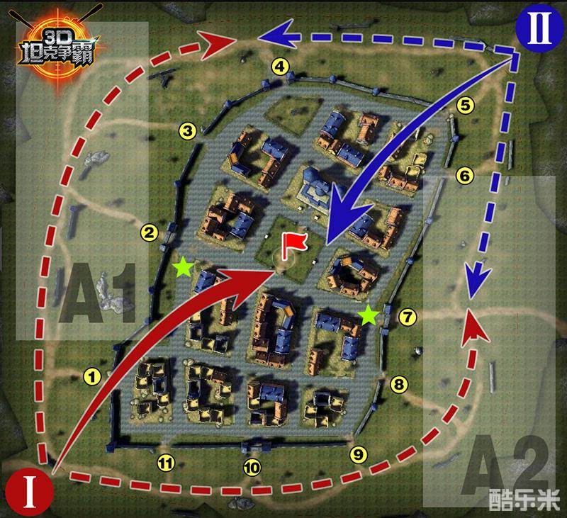 目前相对合理的分配是中坦和轻坦进入A1或A2区域,重坦进入城镇卡掩体压制敌人,但需要根据队伍坦克型号构成进行灵活分配。图中2号和7号黑枪位附近的两个绿色五角星区域是重坦卡点的好位置,既可以盯住黑枪位,又可以防止敌人包抄。