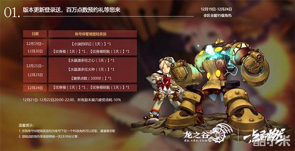 图5 版本更新福利多多!线上好礼登录就送 《龙之谷》在12月19日更新版本后,福利活动又是一波接一波咯。即日起至12月24日,每天上线都有登录好礼。小淑的印记、纹身礼包、潘多拉礼包、海量赛季点数……爽歪歪啦有木有!12月21日和12月22日的每晚20点至22点期间,所有副本疲劳值消耗还会下降50%,记得和小伙伴一起肝起来。另外,与重炮组队刷指定巢穴,还送青金石、保护药、金莲宝、梦幻点数,如果同公会8人组队通关绿龙,活动结束后8人均可获得50个园龙鳞片,又能变得更强了呢!参与更多圣诞版本活动,还有公会之力、无限忘却之契约、强化之锤等奖励送上。还在等神马?!