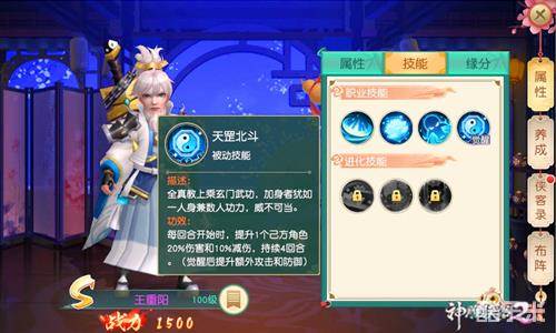 王重阳辅助为主,兼以输出。习得全真教最上乘的玄门武功“天罡北斗”布阵迎敌,使己方角色的攻击和防御得到大幅提升。