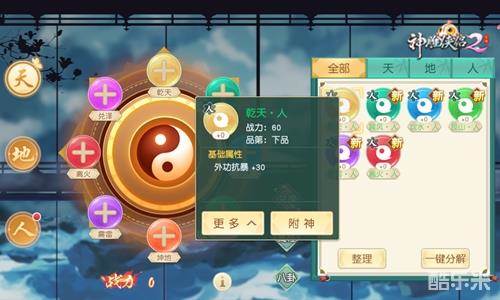 期盼已久,光武的新玩法终于来了。在光武元神玩法中,天、地、人分别对应主角、宠物和侠客,各自获得8个元神位,供对应八卦类型的元神镶嵌。大侠可以通过元神祭炼获得光武元神。每种元神都有着固定的主属性和随机的副属性。元神可以分解,获得元神经验,用以提升其他元神的等级,从而提升元神属性。