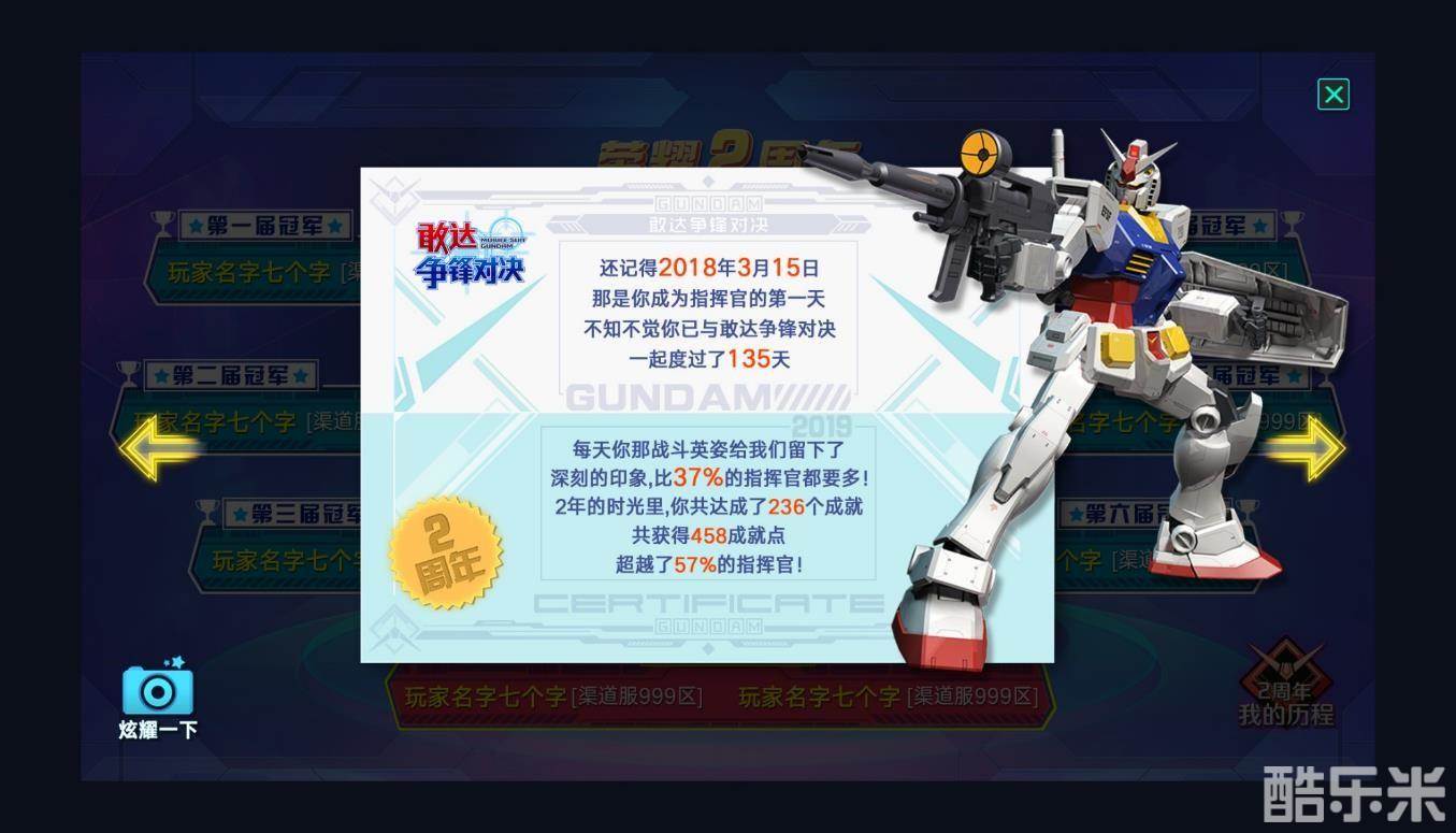 《敢达争锋对决》二周年活动将为全体玩家献上海量福利与稀有奖品。本次活动还将把历届王牌机师赛的冠军展示在荣耀榜上,包括届时将决出的第7届王牌机师赛冠军。另外,每位玩家都可在活动中查看自己2年来的荣耀历程和数据总结。