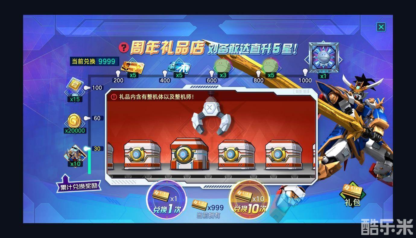 整个庆典活动期间,玩家可使用周年礼品券在周年礼品店兑换奖励,有机会获得来自《BB战士 三国传 风云豪杰篇》,全球首次以真实比例登场于游戏中的刘备敢达(REAL TYPE Ver.)和专属机师,及其机体、机师碎片。累计兑换达到一定次数后,还能直接领取包括刘备敢达在内的额外奖励!抓紧活动机会,让你的刘备敢达直升五星吧!