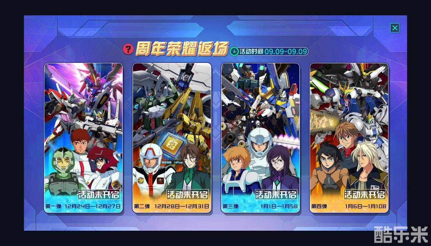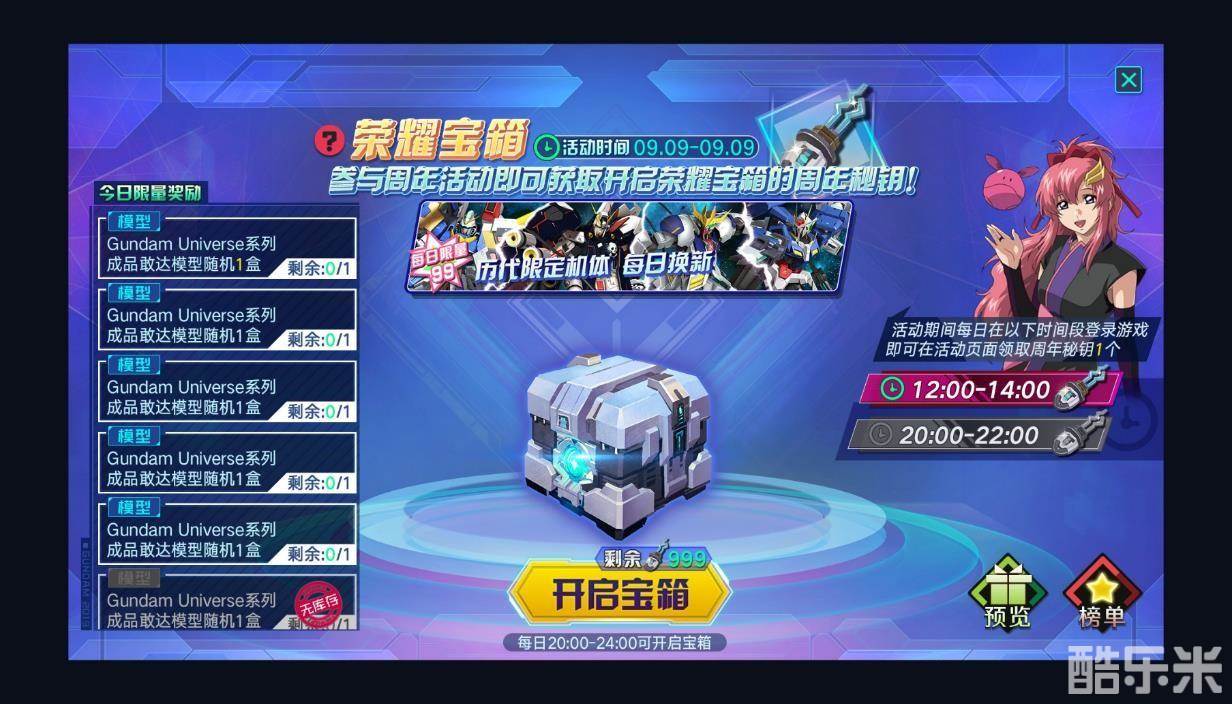 从周年庆典开始到2020年1月7日(持续18天),玩家每天在12:00-14:00和20:00-22:00登录游戏,即可在活动界面领取周年密钥1个,用以在20:00-24:00开启荣耀宝箱,可获得各种限量礼品及道具奖励。其中限量礼品包含METAL ROBOT魂刘备敢达模型、GUNDAM UNIVERSE系列成品敢达模型、《敢达争锋对决》历代限定机体等,每日数量有限,先到先得!