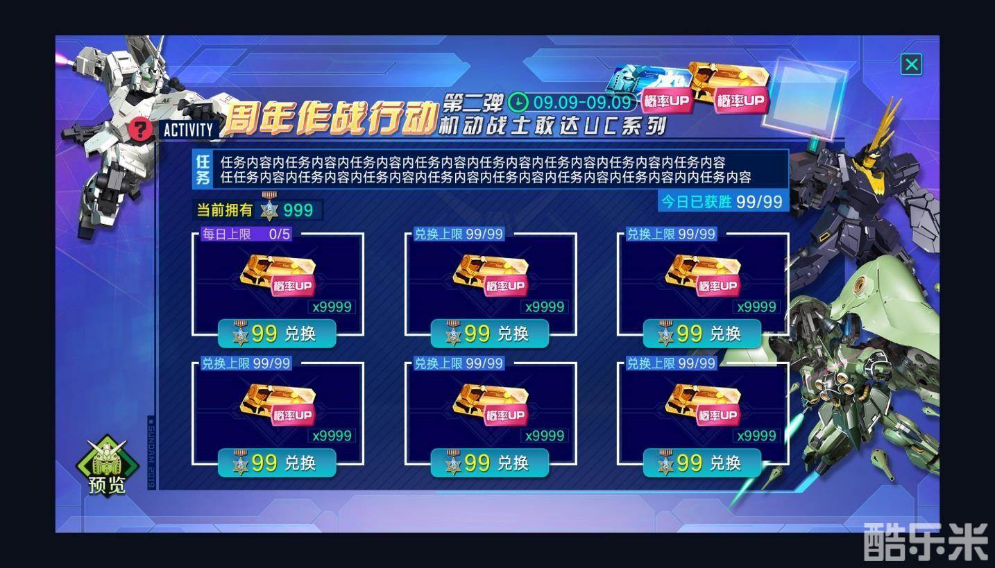 截至庆典结束前,玩家每天前6次在匹配对战、组队竞技场或巅峰对决的对战中获胜即可获得1个周年作战勋章,可用于兑换周年礼品券、周年密钥等活动奖品和其他补给福利。另外,周年作战活动将分为四期主题,使用主题限定机体获得对战胜利,可获得双倍勋章奖励!开动你的爱机,用胜利为自己赢得珍贵奖品!