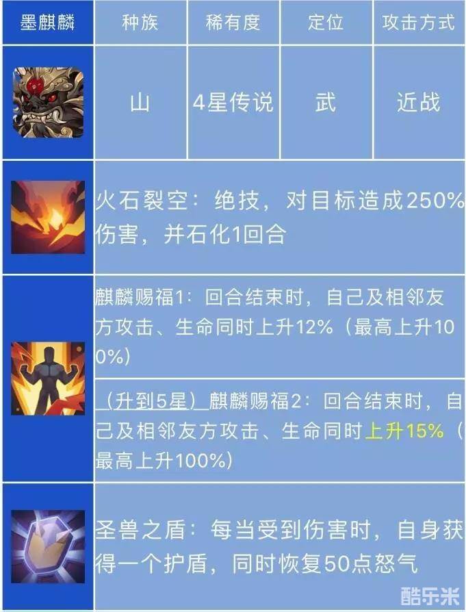 二技能是墨麒麟的招牌技能,麒麟在场时给自身附近单位附带一个小“神迹”效果,血量和攻击每回合有百分比提升,最高上限为100%,同时提高自身和同伴的站场能力。