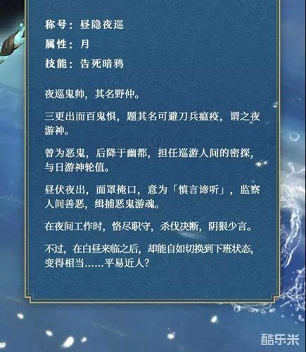 黑夜是夜游神最好的伙伴,他行走在夜幕中,恪尽职守,杀伐果敢,沉默寡言,是令百鬼拜服的夜巡鬼帅。但到了白天,他却变得平易近人,甚至显得有些松懈散漫,究竟哪个才是真实的他?这需要降妖师们自己去解开谜底。