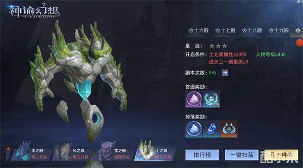 每个秘境共有20殿,副本玩法相对简单,只需要在限定时间内击杀所有怪物即可,但是下一殿需要三星通关并且元素属性达到要求才可以进行挑战!